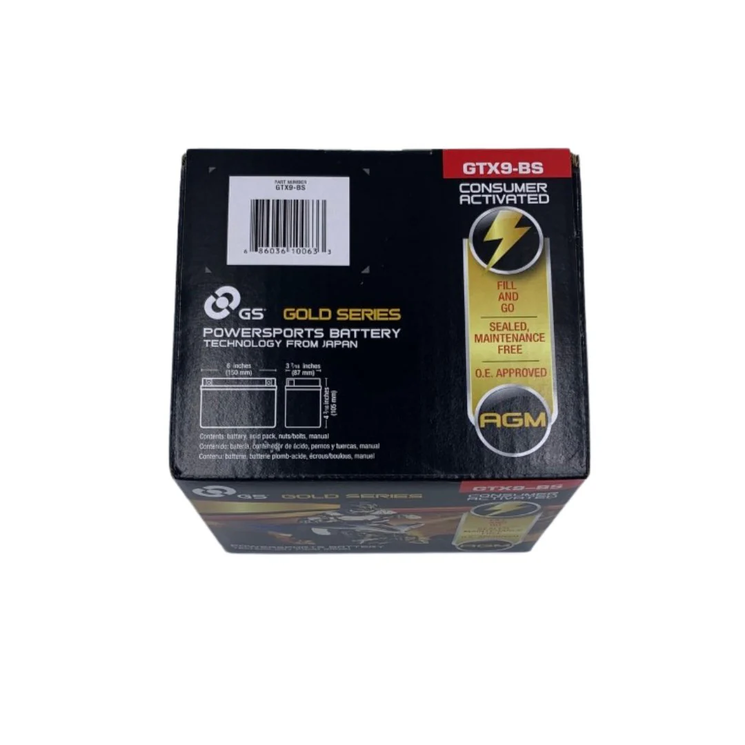 Cross Reference: Champion 9BS, Deka ETX9, GS (JBS) GTX9-BS, GS (ZYI) GTX9-BS, Motocross M329BS/M429BS, Napa 740-1825, Sears 44025. Wal-Mart ES9BS, Yacht CTX9-BS, Yuasa YTX9-BS, Powersonic PTX9-FS
