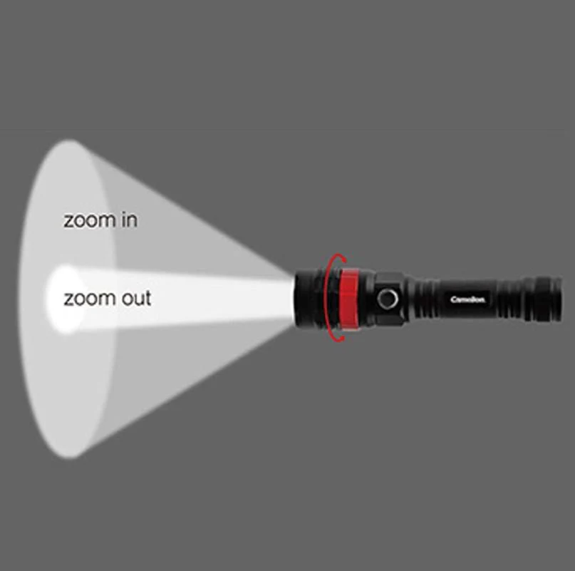 The Camelion RT395 rechargeable flashlight has an aircraft aluminum body with anodized surfaces. Its' T6 LED provides an ultra bright light beam. This flashlight has 5 lighting modes and allows the user to adjust the focus by easily turning the ring. Powered by a lithium-ion battery, this item is ideal for outdoor activities and security.